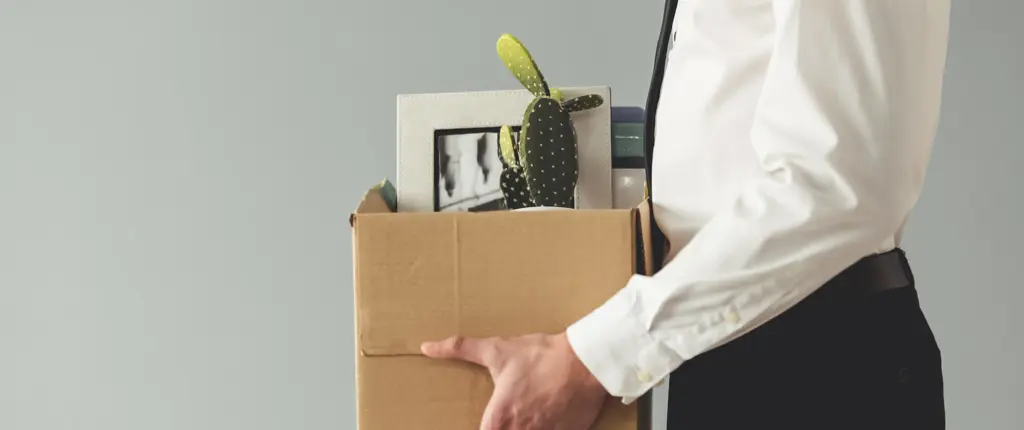 werknemer houdt doos vast met spullen van bureau na ontslag
